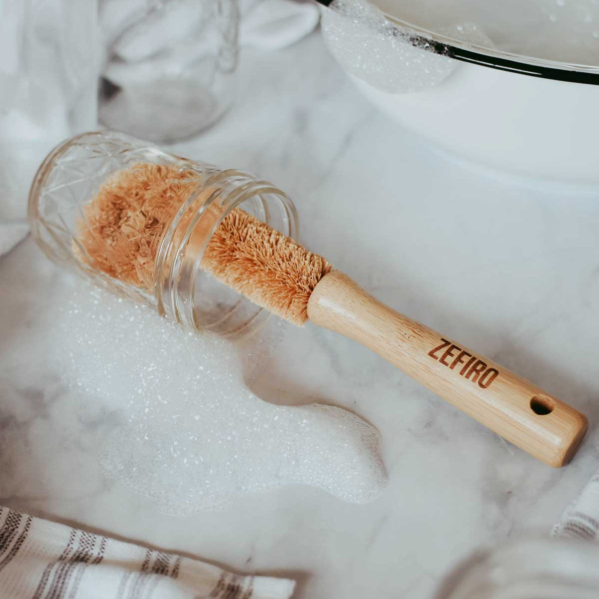 The handle is made from sustainable bamboo and this brush has rough, plant-based coconut fibre bristles. Perfect for getting into coffee mugs, wine glasses, jars and bottles.