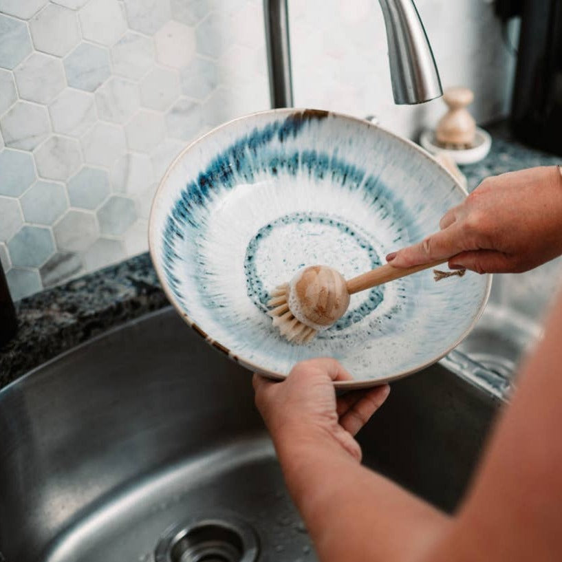 The handle is made from sustainable bamboo and this brush has soft, plant-based sisal bristles. This brush is ideal for almost all the dishes in your home! Store your brush bristle side down, to ensure it is fully dry. Replaces plastic dish sponge. There are staples in the brush head but once removed the brush is fully compostable and vegan. Most kitchen scourers are made of plastic or metal and are not biodegradable.